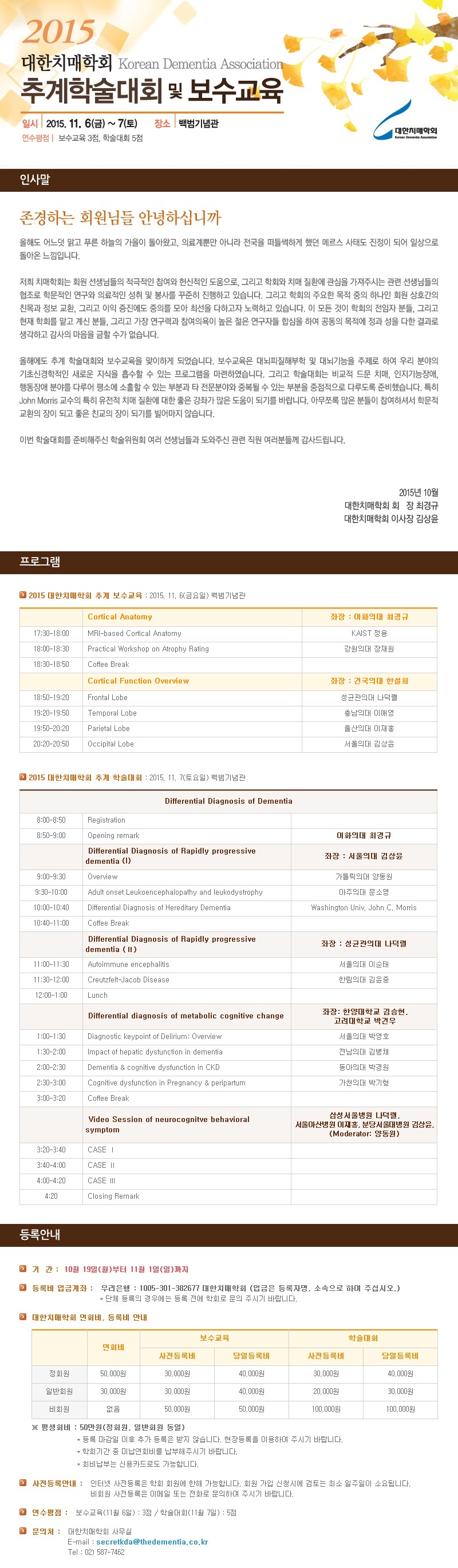 2015 대한치매학회 추계 학술대회 및 보수교육 안내