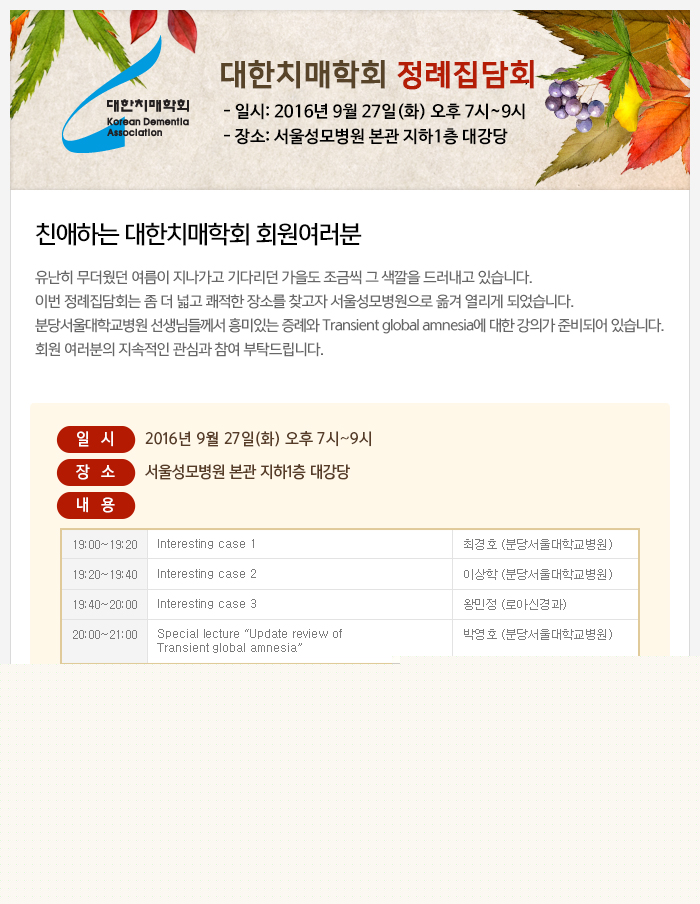 대한치매학회 9월 정례집담회 안내