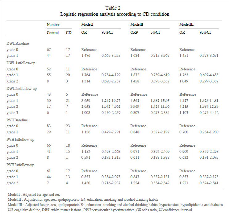 를 사용하였다. 각각의 변수와 인지저하군간의 관계를 의미 있게 조정하기 위해 logistic regression analysis로 나이, 성별, Apo E4