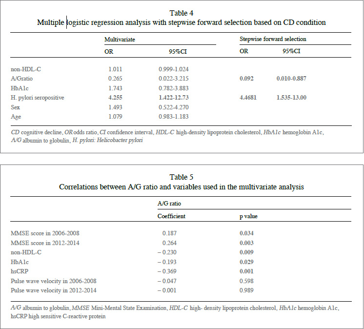 연구에서는 인지저하의 빈도가 albumin이 아닌 A/G ratio와 연관된 것으로 보여졌다. 이러한 결과는 본 연구에서는 albumin level