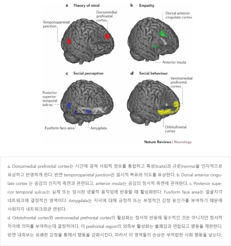 within)의 상호작용 붕괴로 이해되어야 한다. 네 종류 사회인지와 일관되게 관련을 가진다고 보고된 뇌영역을 다음 그림에