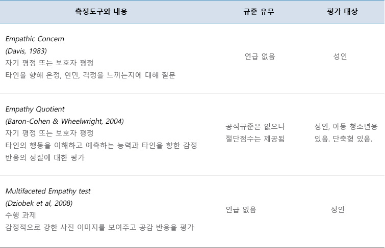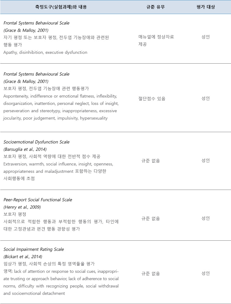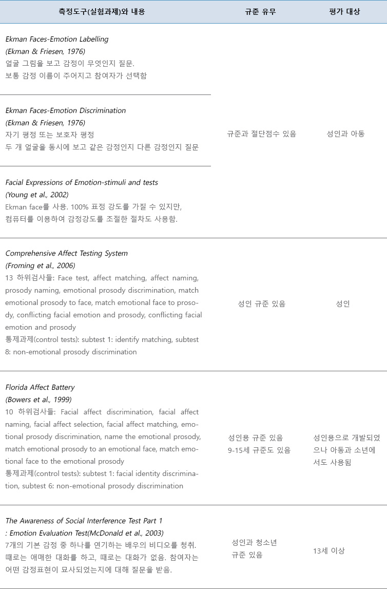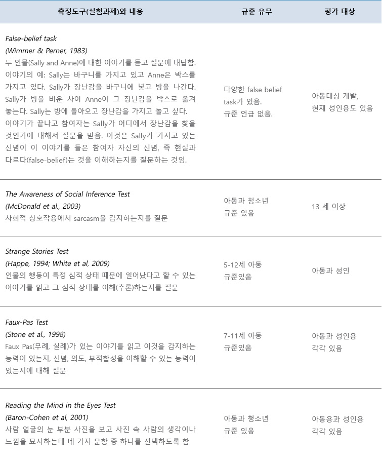 네 종류의 사회인지 측정도구들을 선택하여 다음에 제시하였다. 측정도구들은 임상에서 사용되는 정도, 신뢰도와 민감도, 적합한